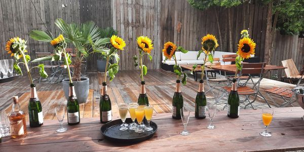 Diese unkonventionelle Kreation erinnert uns daran, dass Schönheit in den unerwartetsten Ecken unseres Lebens erblühen kann. Die Sonnenblumen, die aus den Sektflaschen emporwachsen, symbolisieren die Freude der Transformation und die Harmonie zwischen Kunst und Natur.